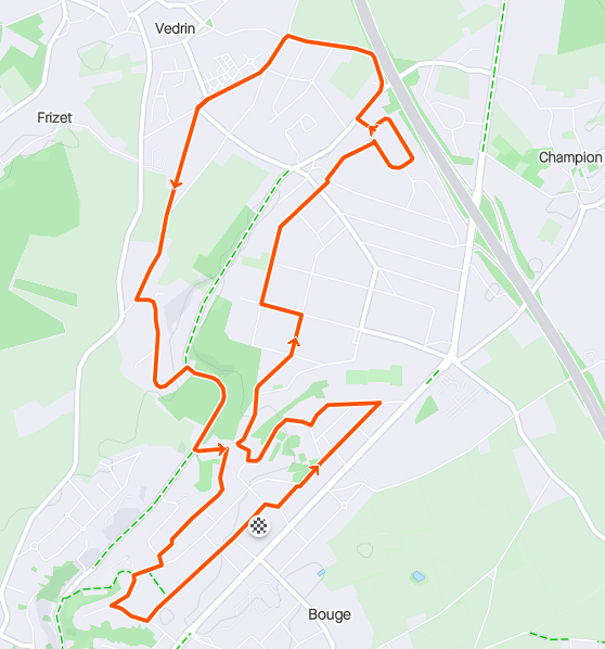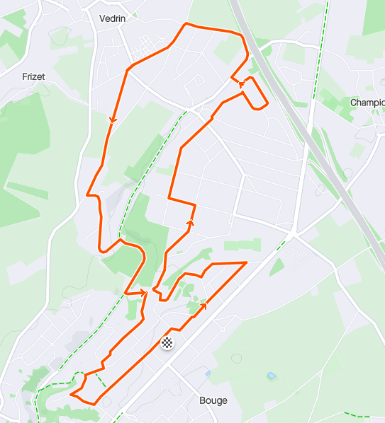 Description: Le parcours semi-vallonné traverse Bouge et une partie de Vedrin. Principalement sur des petites routes de villages, avec une section de 200 mètres de graviers. Pas de chemins boisés.